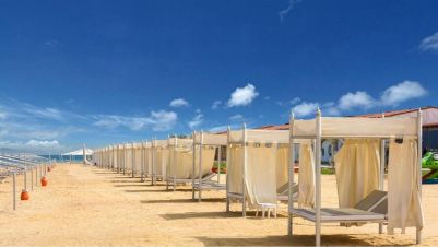 Собствен пясъчен плаж със залив и 3 плувни басейна, включително 1 за деца с чадъри, шезлонги с матраци, плажни огради за защита от вятъра, обслужване от бара, спасители на басейна и на плажа, кърпи за плажа и басейна, табели около басейна;