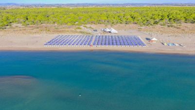 Намира се на 500 метра от хотела и може да бъде достигнат по пътеки през уникална красива пиниева гора, където ще се насладите на девствената природа на Йонийско море. Наличен е и трансфер до плажа. На стая се полагат 1 чадър и 2 шезлонга. Пясъчен плаж, ситен пясък, пясъчно дъно.