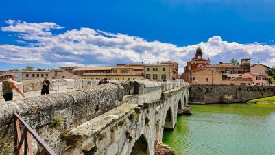 Пешеходна разходка в историческия център на Римини. Разглеждане на Арката на Октавиан Август,Старата часовникова кула, катедралната църква „Малатеста”, изграденa в средата на 15 в. като погребална църква на управляващата фамилия Малатеста,